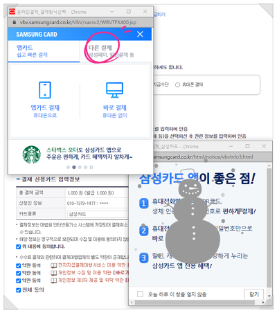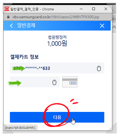 어떤 것으로 결제 하던 순서는 똑 같습니다. 계속 갑니다.