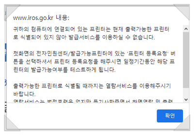 발급을 선택했을 때 발급이 가능한 프린터를 확인하라는 메시지가 나옵니다.