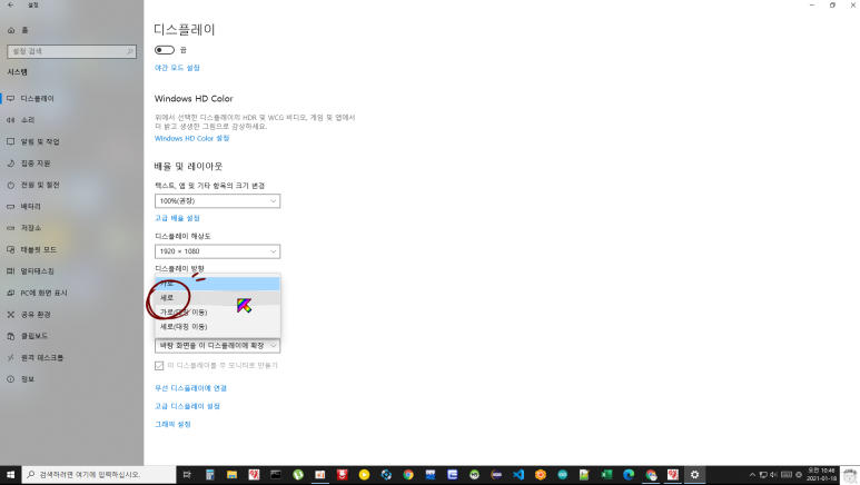 지금 윈도우즈10 에서는 단순히 모니터만 세로로 하고