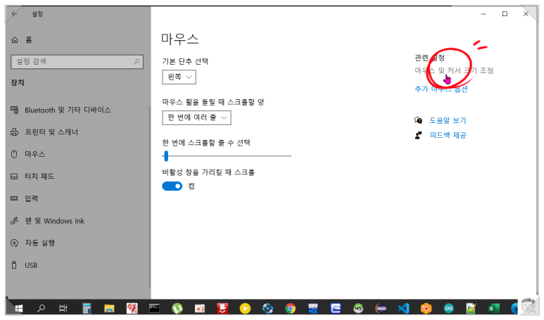 마우스의 포인터 크기와 색깔을 변경해 봅시다.