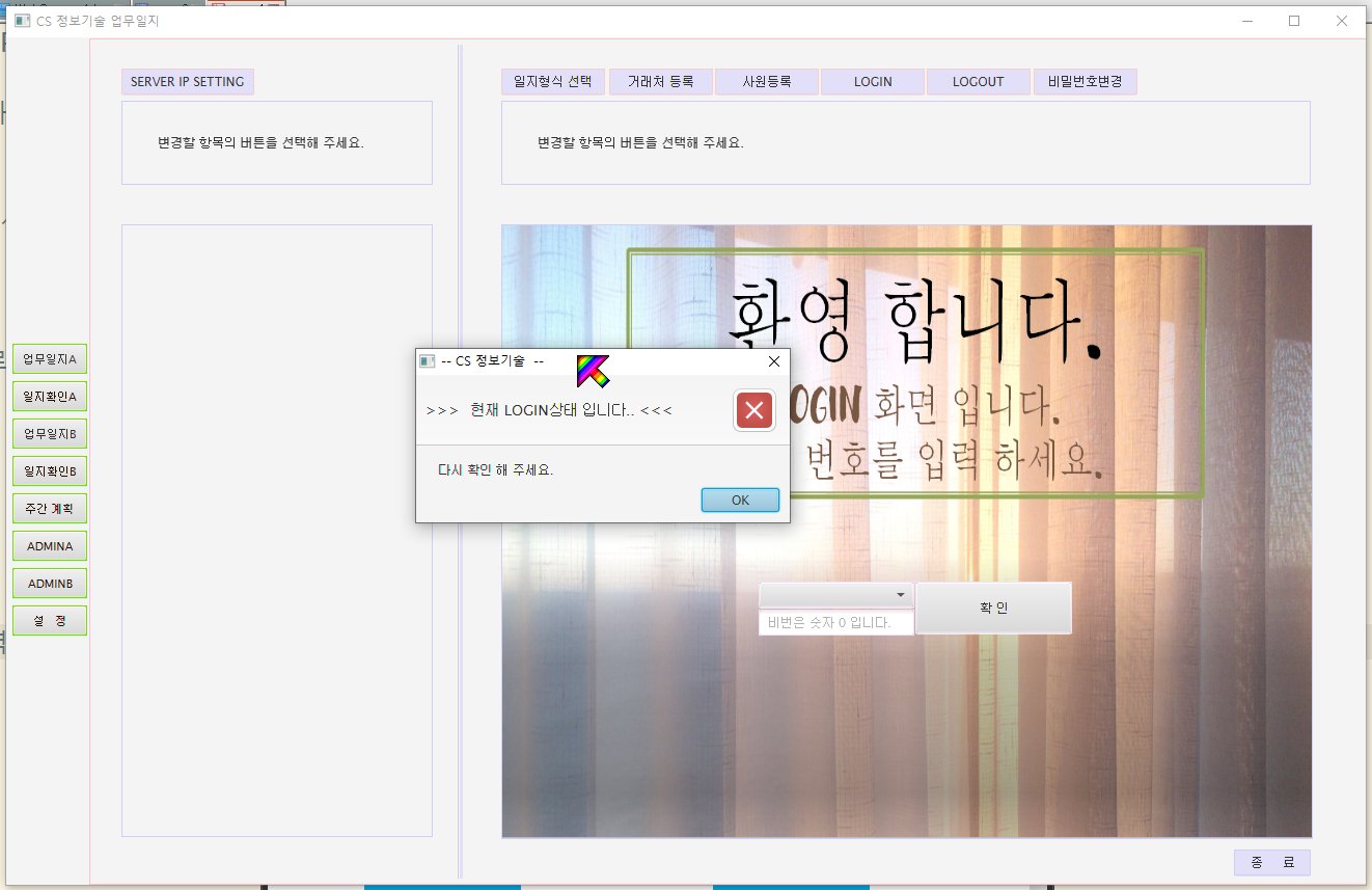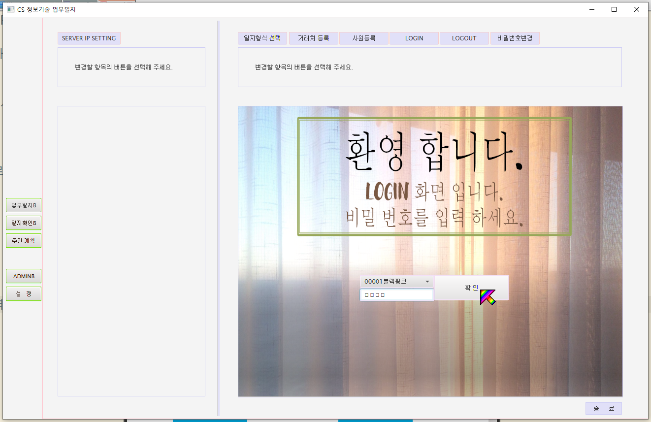 아이디는 사용자등록에서 설정한 ID 이며 패스워드는 초기는 숫자 0 이고