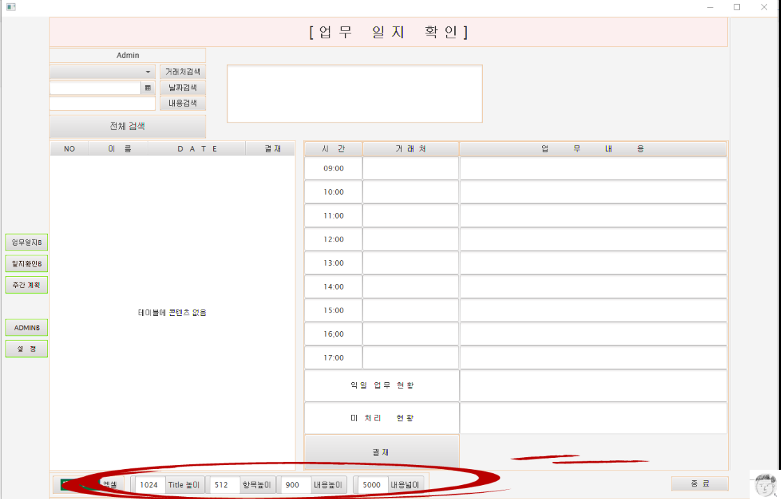 3. 왼쪽 메뉴 중 [일지 확인]과 [ADMIN] 그리고 엑셀 화면