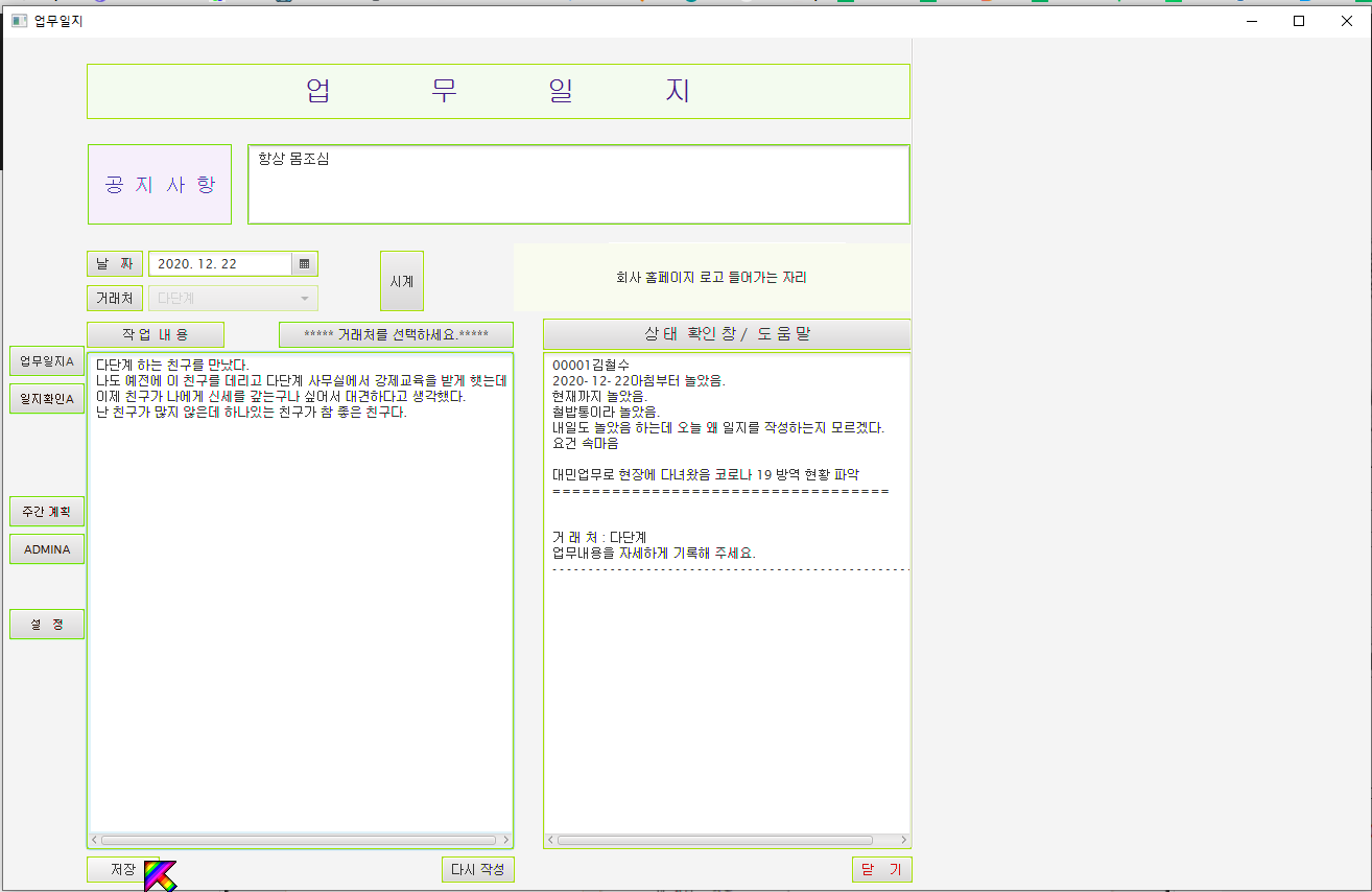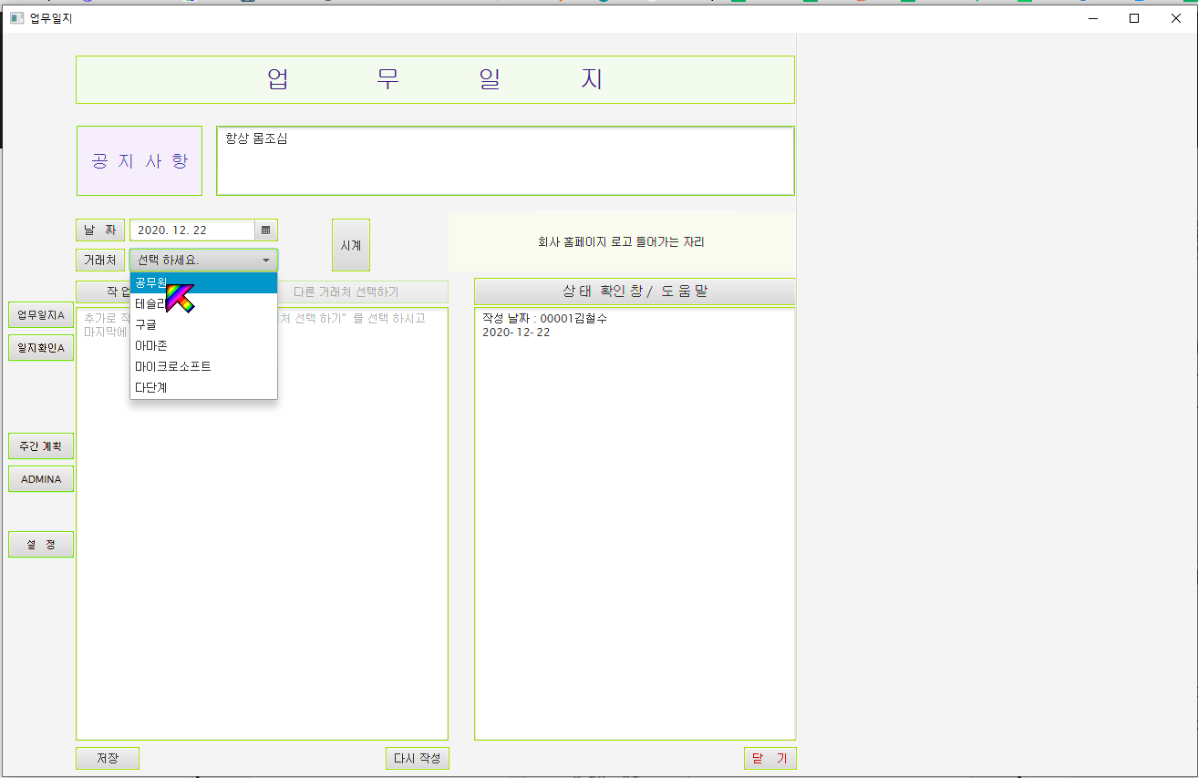 다른 거래처의 업무를 작성하려면 위의 다른 거래처 선택하기를 눌러서 다른 거래처를 선택하고 작성하면 된다.