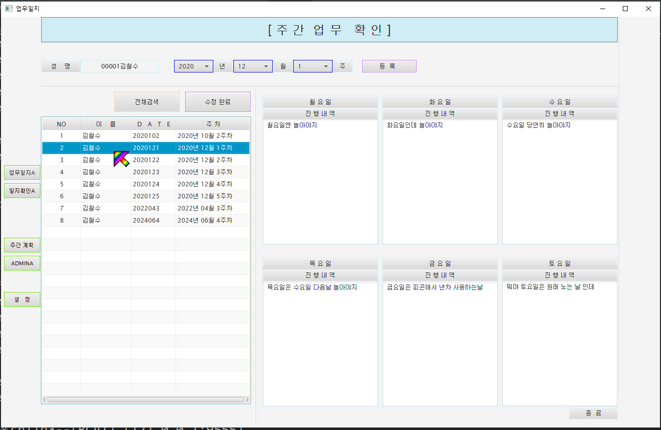 위의 연도, 월 , 주간을 선택 하시고 등록을 하면 아래의 요일칸에 작성한 내용이 저장됩니다.