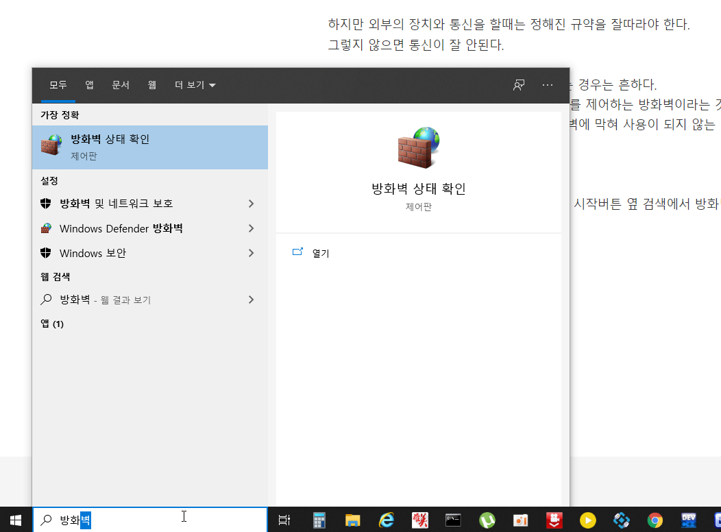 윈도즈 10은 시작 버튼 옆 검색에서 방화벽이라고 검색하면 나온다.