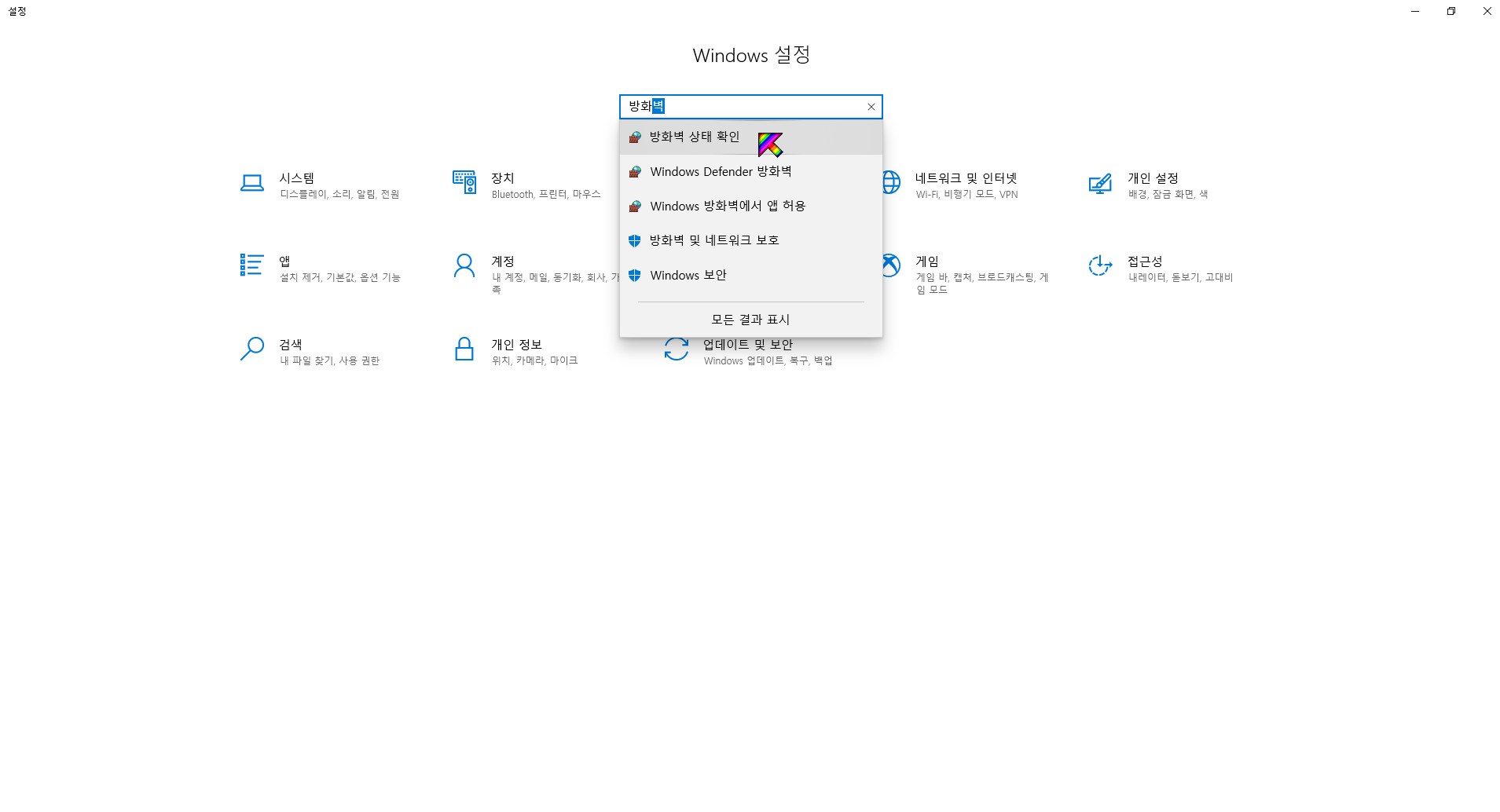 시작 -> 설정-> 방화벽으로 검색해서 방화벽 상태 확인