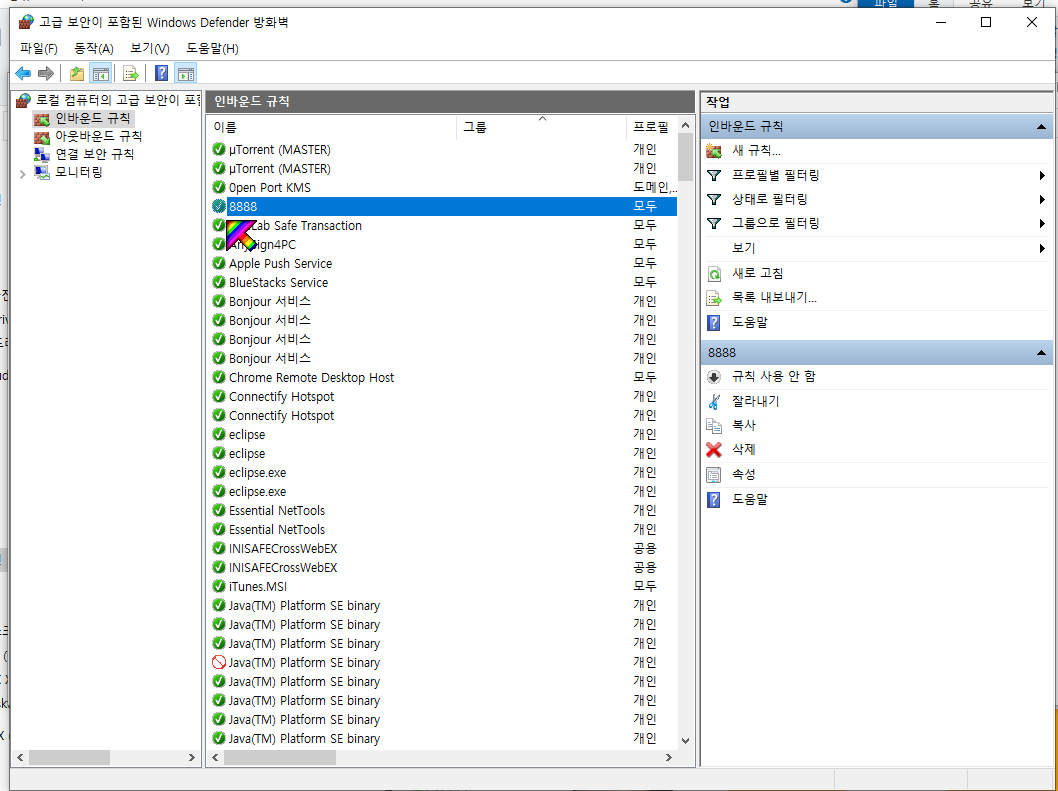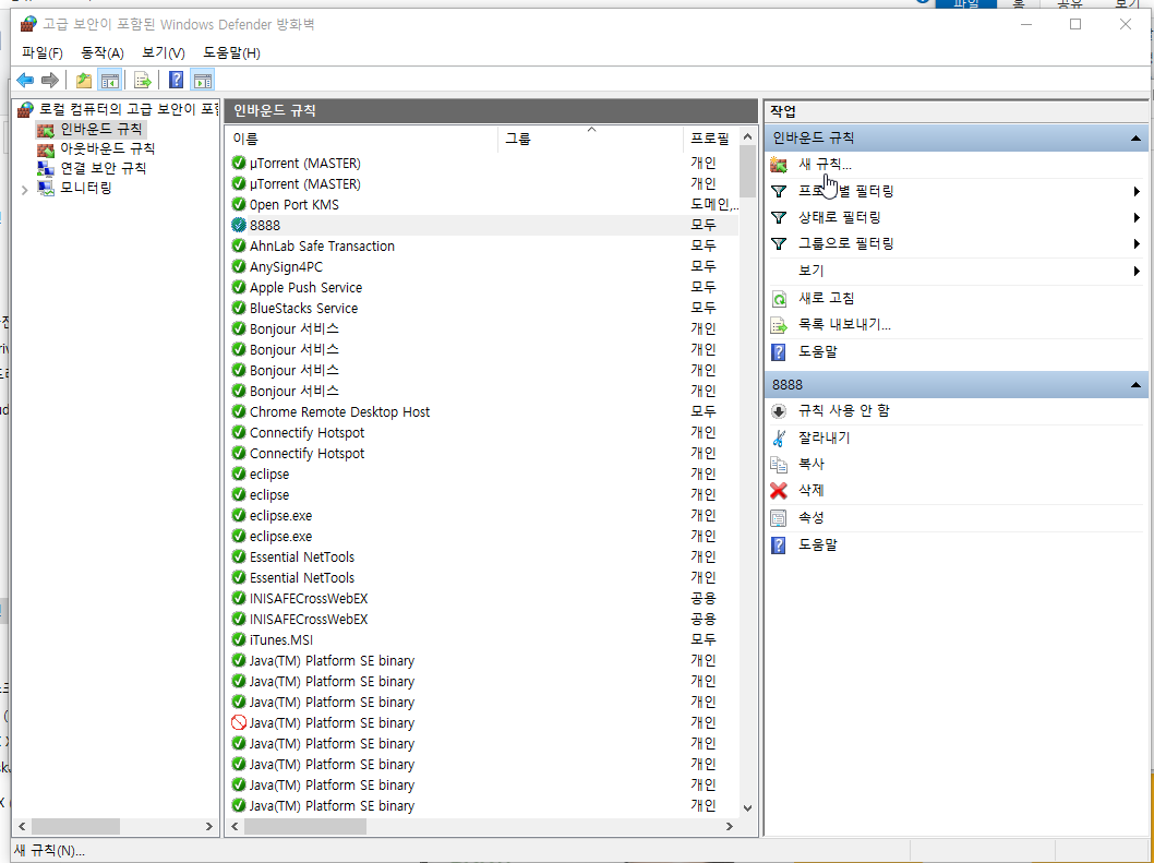 인바운드 규칙을 선택하고 오른쪽 위의 새 규칙... 을 선택한다.