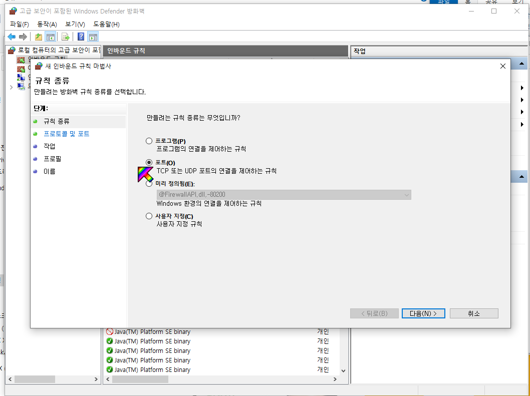 윈도즈에서 방화벽으로 간다.